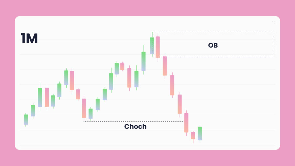 - CHoCH (Change of Character), structure shift showing displacement back inside the range.